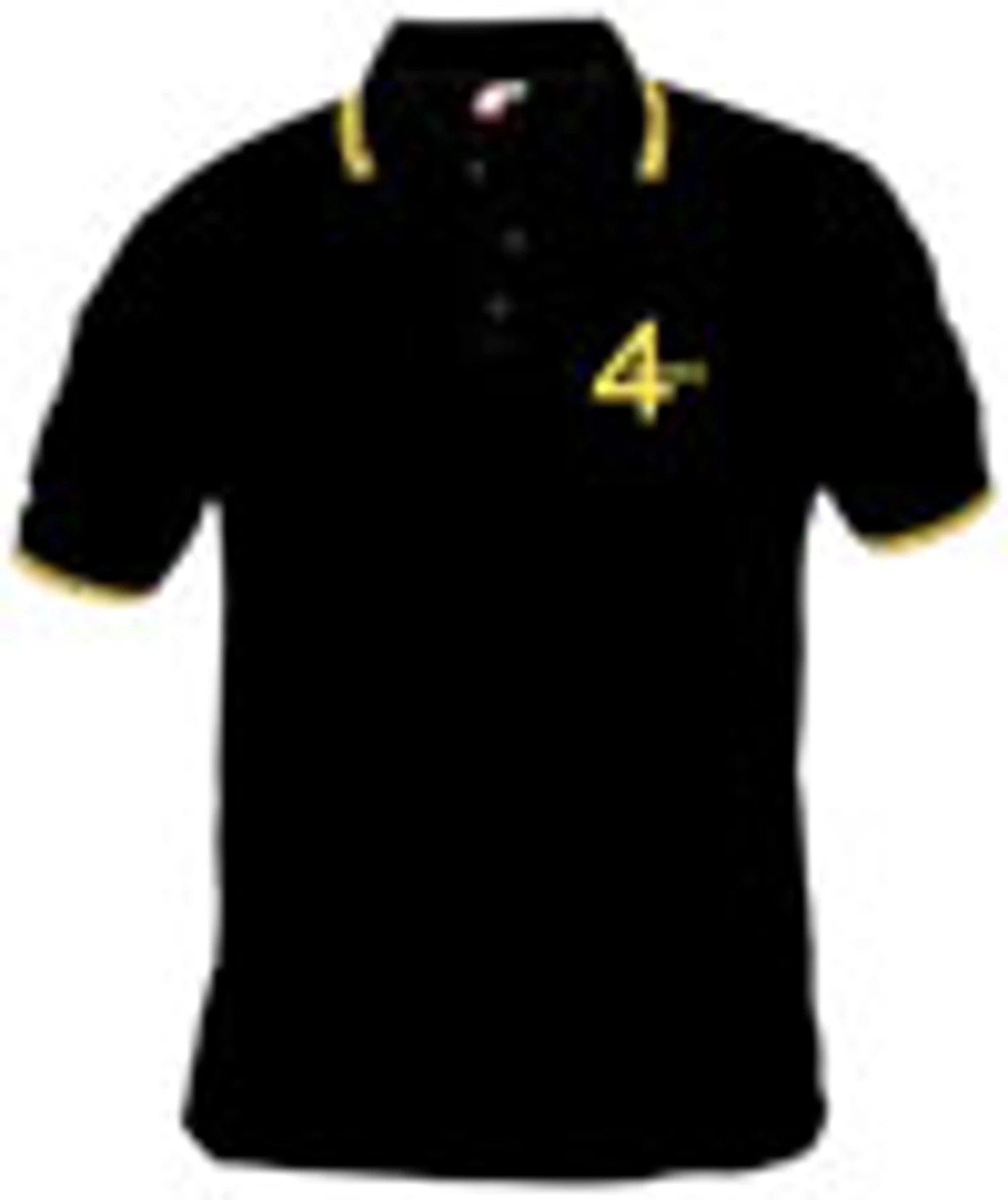 Schwarzes Polohemd aus 100% Baumwolle mit 2-er Knopfleiste. Kontraststreifen an Ärmel und Kragen in goldgelb und „4 Skins“ Logo als 1-farb Bestickung auf linker Brustseite.</p>