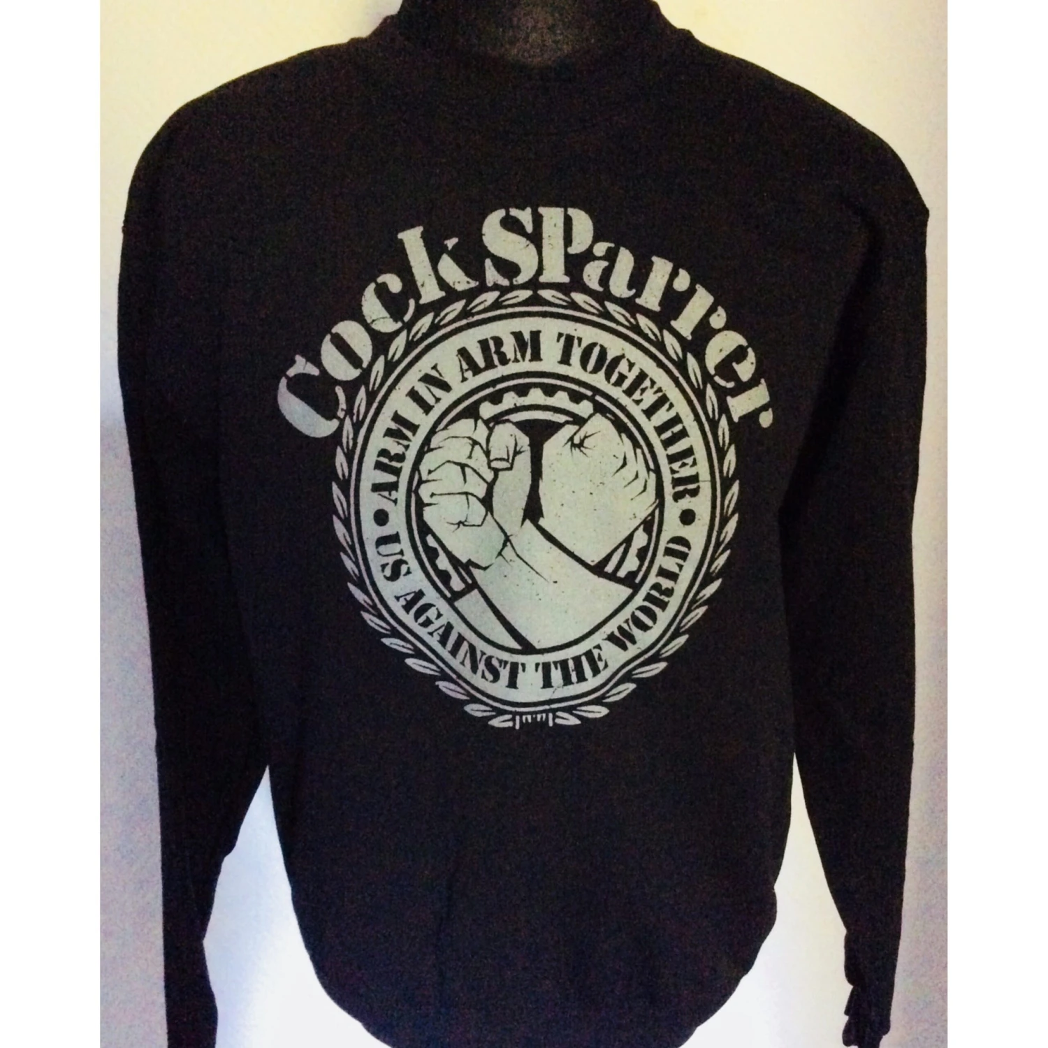 Fruit of the Loom Sweatshirt. Großer grauer Brustdruck auf schwarzem Pullover. Cock Sparrer: Arm in Arm.</p>