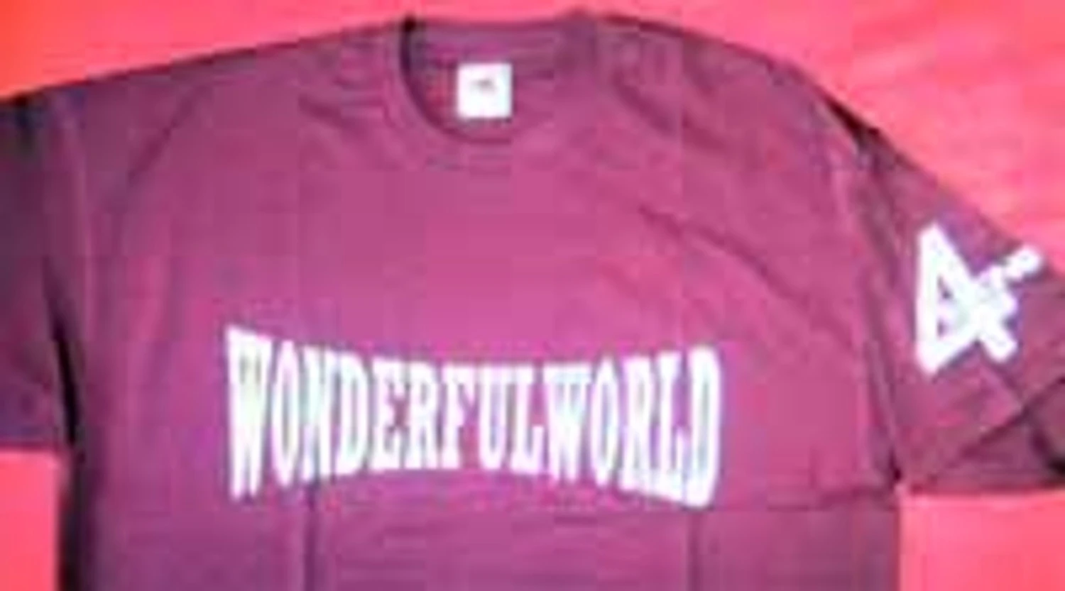 neuestes Shirt der Kult Band aus England. Bordofarbenes T-Shirt mit großem Brustdruck (wonderfulworld) in skyblue und Ärmellogodruck. Zur Einführung inklusive Porto per Vorkasse im Brief, auch wenn etwas anderes angezeigt wird.</p>